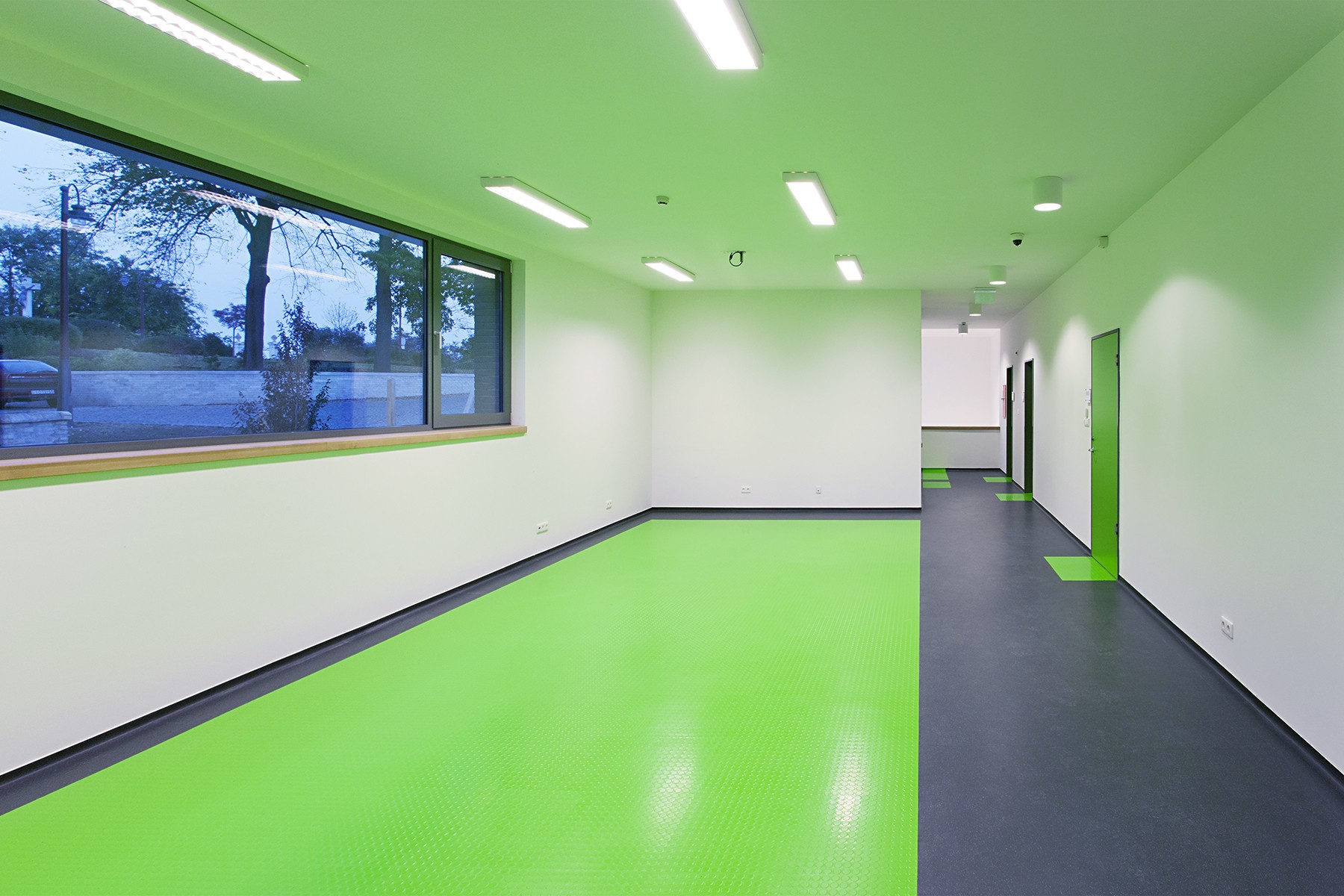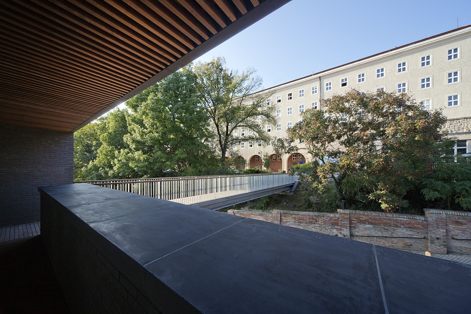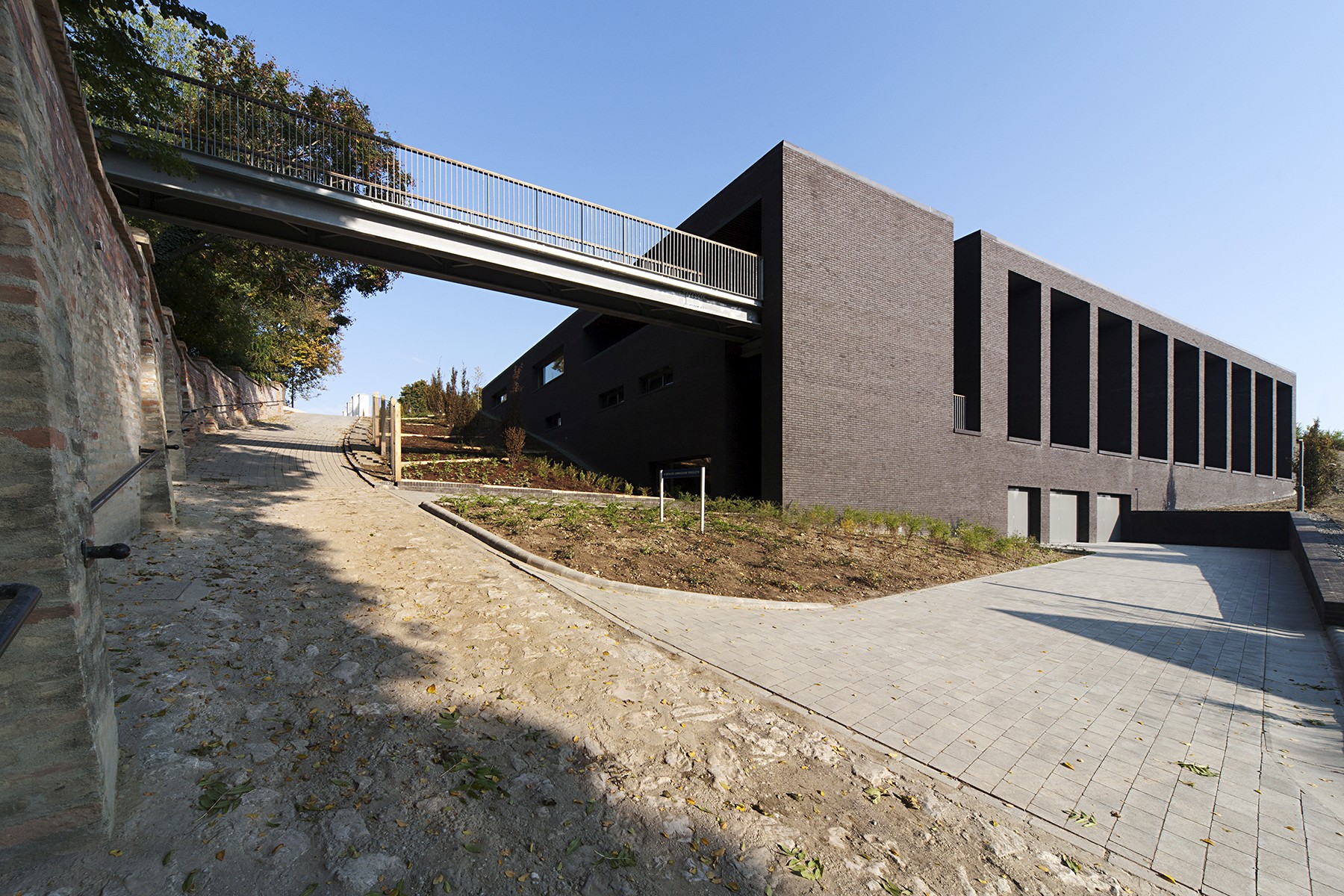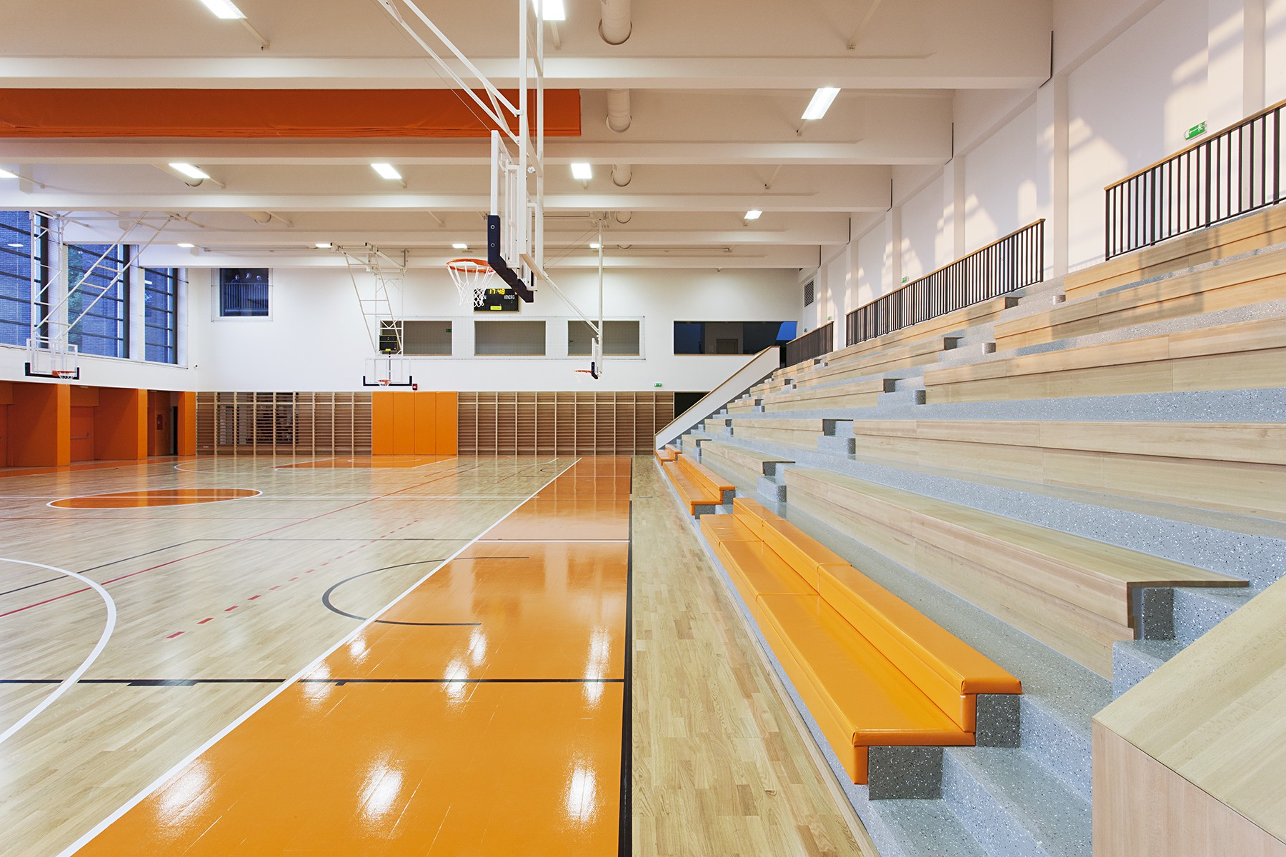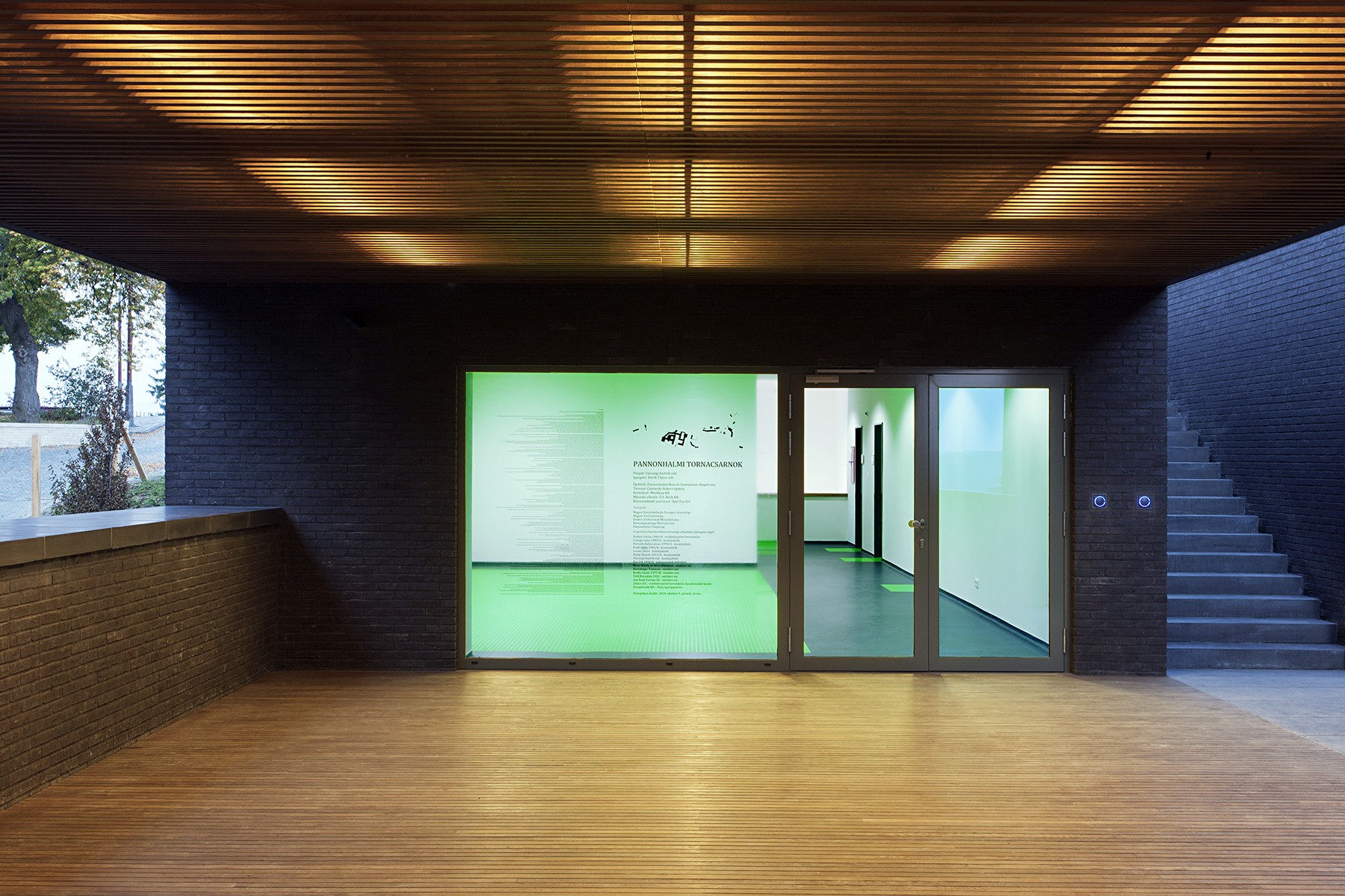 „The new sports hall of the Benedictine monastic community was opened in Pannonhalma in autumn 2014. Originally built in 1942, the boarding school has acquired its present-day design as an organic continuation of the old complex of the abbey. In 2007, almost 70 years after the foundation of the school, Robert Gutowski Architects was commissioned to design the new gymnasium of the school. As the area is an UNESCO World Heritage Site, taking due care was a priority. The building itself is strictly functional and has been sunk into the steep terrain which seems to be a great geothermic solution, whilst leaving the view of the Bakony Hills undisturbed. Rationalism prevailed without fail as far as the functional configuration is concerned which has been designed to be perfectly clear and transparent, much in the same way as it defines the static system of the building and the intelligent combination of natural and artificial engineering technologies." (meonline)